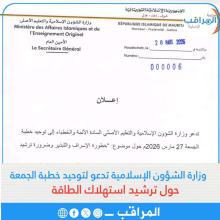 وزارة الشؤون الإسلامية تدعو إلى توحيد خطبة الجمعة حول خطورة الإسراف