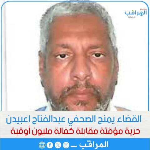 قررت الغرفة الجزائية بمحكمة نواكشوط الغربية، اليوم، منح الصحفي عبد الفتاح اعبيدن حرية مؤقتة، وذلك مقابل دفعه مبلغ مليون أوقية قديمة لصالح خزينة الدولة.