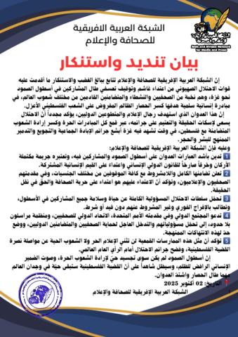 إنّ الشبكة العربية الإفريقية للصحافة والإعلام تتابع ببالغ الغضب والاستنكار ما أقدمت عليه قوات الاحتلال الصهيوني من اعتداء غاشم وتوقيف تعسفي طال المشاركين في أسطول الصمود نحو غزة، وهم نخبة من الصحفيين والنشطاء والمتضامنين القادمين من مختلف شعوب العالم، في مبادرة إنسانية سلمية هدفها كسر الحصار الظالم المفروض على الشعب الفلسطيني الأعزل.