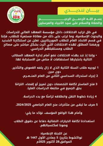 في ظل تزايد الاختلالات داخل مؤسسة المعهد العالي للدراسات والبحوث الإسلامية، وما ترتب على ذلك من معاناة مستمرة للطلاب، فإننا في قسم الاتحاد العام للطلاب الموريتانيين، نعلن عن استنكارنا الشديد ورفضنا المطلق لهذه الاختلالات التي أثرت بشكل مباشر على مصالح الطلاب ومستقبلهم الدراسي.