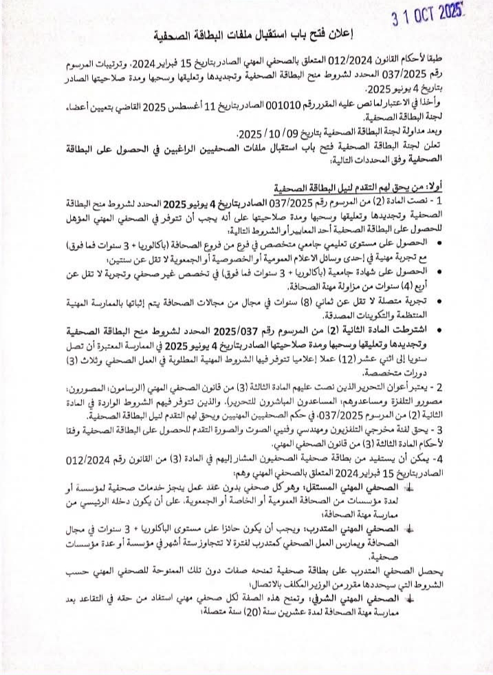 أعلنت لجنة البطاقة الصحفية عن فتح باب استقبال ملفات الصحفيين الراغبين في الحصول على البطاقة الصحفية المهنية، وذلك تطبيقًا لأحكام القانون رقم 2024/012 الصادر بتاريخ 15 فبراير 2024 المتعلق بالصحفي المهني، وعملاً بمقتضيات المرسوم رقم 2025/037 الصادر بتاريخ 4 يونيو 2025 المحدد لشروط منح البطاقة الصحفية وتجديدها وتعليقها وسحبها ومدة صلاحيتها.