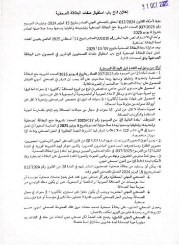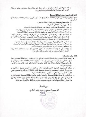 ودعت اللجنة جميع الصحفيين الراغبين في الحصول على البطاقة إلى تقديم ملفاتهم وفق المحددات والشروط التي ستُعلن لاحقًا عبر القنوات الرسمية المعتمدة.