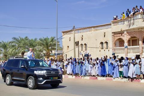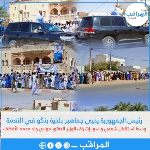 في أجواء حماسية تعبّر عن الدعم الشعبي الكبير، حيّا فخامة رئيس الجمهورية السيد محمد ولد الشيخ الغزواني صباح اليوم جماهير بلدية بنگو بولاية الحوض الشرقي، التي احتشدت على طول الطريق الرئيسي المؤدي إلى المدينة، رافعة الأعلام الوطنية واللافتات المرحبة بقدومه.