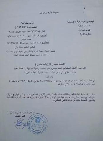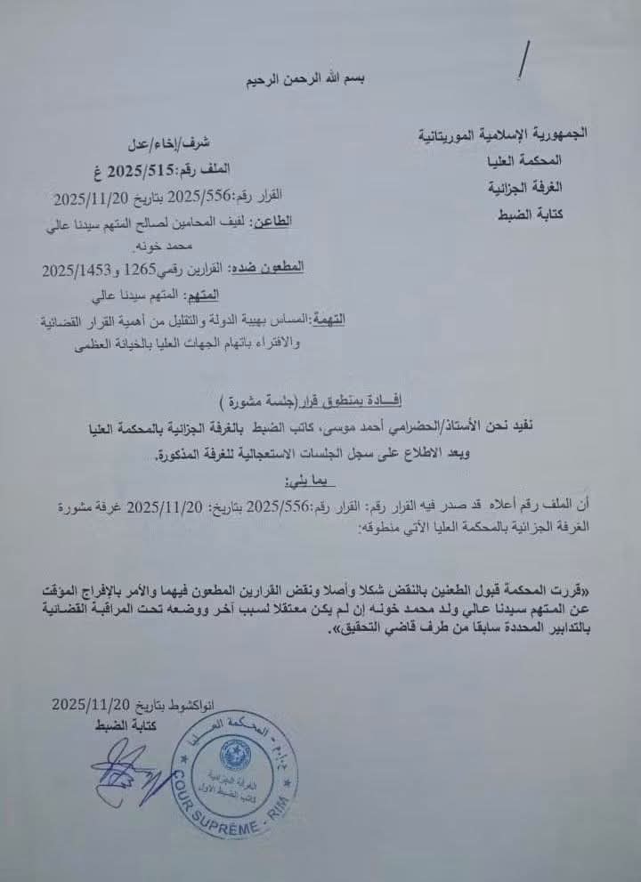 قررت الغرفة الجزائية بالمحكمة العليا، اليوم، منح الوزير السابق سيدنا علي محمد خون حريةً مؤقتة، وذلك وفق منطوق القرار الصادر عنها.