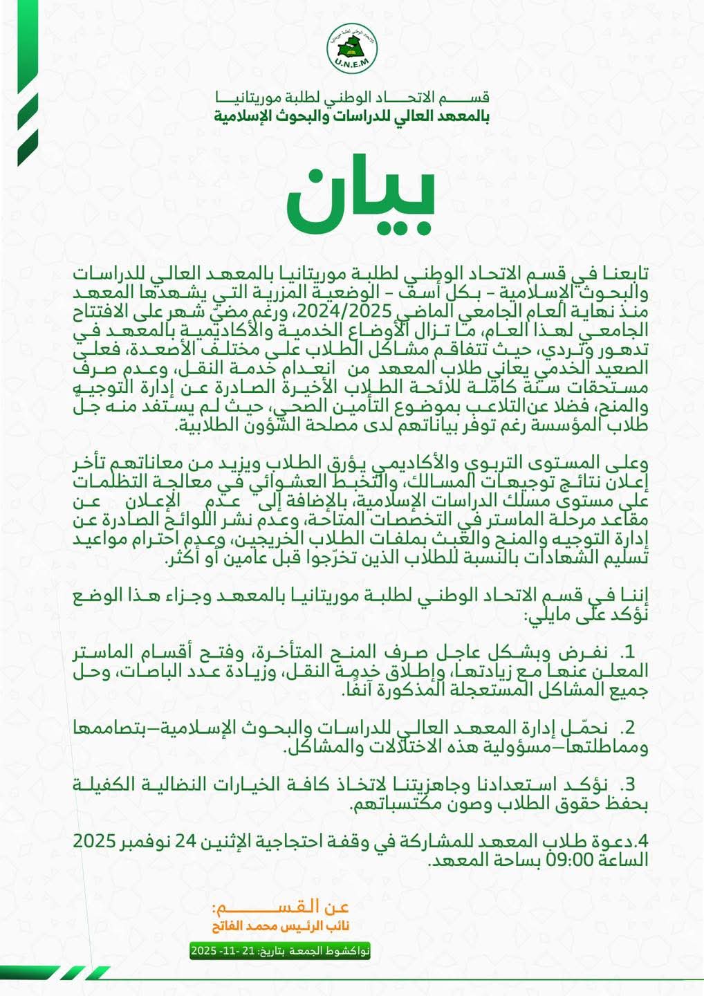 تابعنا في قسم الاتحاد الوطني لطلبة موريتانيا بالمعهد العالي للدراسات والبحوث الإسلامية – بكل أسف – الوضعية المزرية التي يشهدها المعهد منذ نهاية العام الجامعي الماضي 2025/2024، ورغم مضيّ شهر على الافتتاح الجامعي لهذا العام، ما تزال الأوضاع الخدمية والأكاديمية بالمعهد في تدهور وتردي، حيث تتفاقم مشاكل الطلاب على مختلف الأصعدة، فعلى الصعيد الخدمي يعاني طلاب المعهد من انعدام خدمة النقل، وعدم صرف مستحقات سنة كاملة للائحة الطلاب الأخيرة الصادرة عن إدارة التوجيه والمنح، فضلا عن التلاعب بموضوع التأمين الصحي، حيث لم يستفد منه جلُّ طلاب المؤسسة رغم توفر بياناتهم لدى مصلحة الشؤون الطلابية.