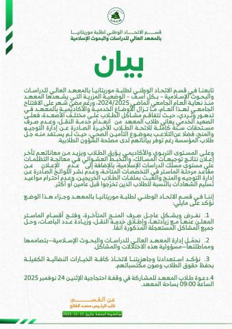 إننا في قسم الاتحاد الوطني لطلبة موريتانيا بالمعهد وجزاء هذا الوضع نؤكد على مايلي: