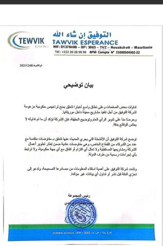 أصدرت شركة التوفيق (TAWVIK ESPERANCE) بيانًا توضيحيًا على خلفية ما تم تداوله في بعض الصفحات من أخبار تتعلق بمنح تراخيص حكومية لصالح الشركة لتنفيذ مشاريع داخل موريتانيا. وأكدت الشركة أن ما تم تداوله لا يعكس الواقع بأيٍّ من الوجوه.