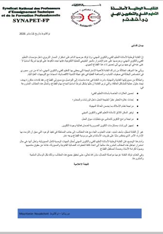 إنّ النقابة الوطنية لأساتذة التعليم الفني والتكوين المهني، وإذ تؤكد حرصها الدائم على استقرار المسار التربوي داخل مؤسسات التعليم الفني والتكوين المهني، وحرصها على عدم الإضرار بالسير الطبيعي للعملية التكوينية، فإنها تجدد تأكيدها على كونها شريكًا أساسيًا لا غنى عنه في أي جهد يرمي إلى تحسين أداء هذا القطاع الحيوي.
