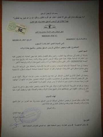 وجه دفاع الرئيس السابق محمد ولد عبد العزيز طلبا إلى ادارة السجون لتمكينه من حضور تشييع جنازة والده عبد العزيز ولد أعليه الذي وافاه الأجل المحتوم مساء الجمعة بمستشفيات نواكشوط ،وحسل مصادر مطلعة فإن السلطات بدأت في ترتيبات اخراج الرئيس السابق من السجن ،حيث سيحضر الصلاة على والده وربما البقاء في منزل الأسرة لتلقي التعازي.