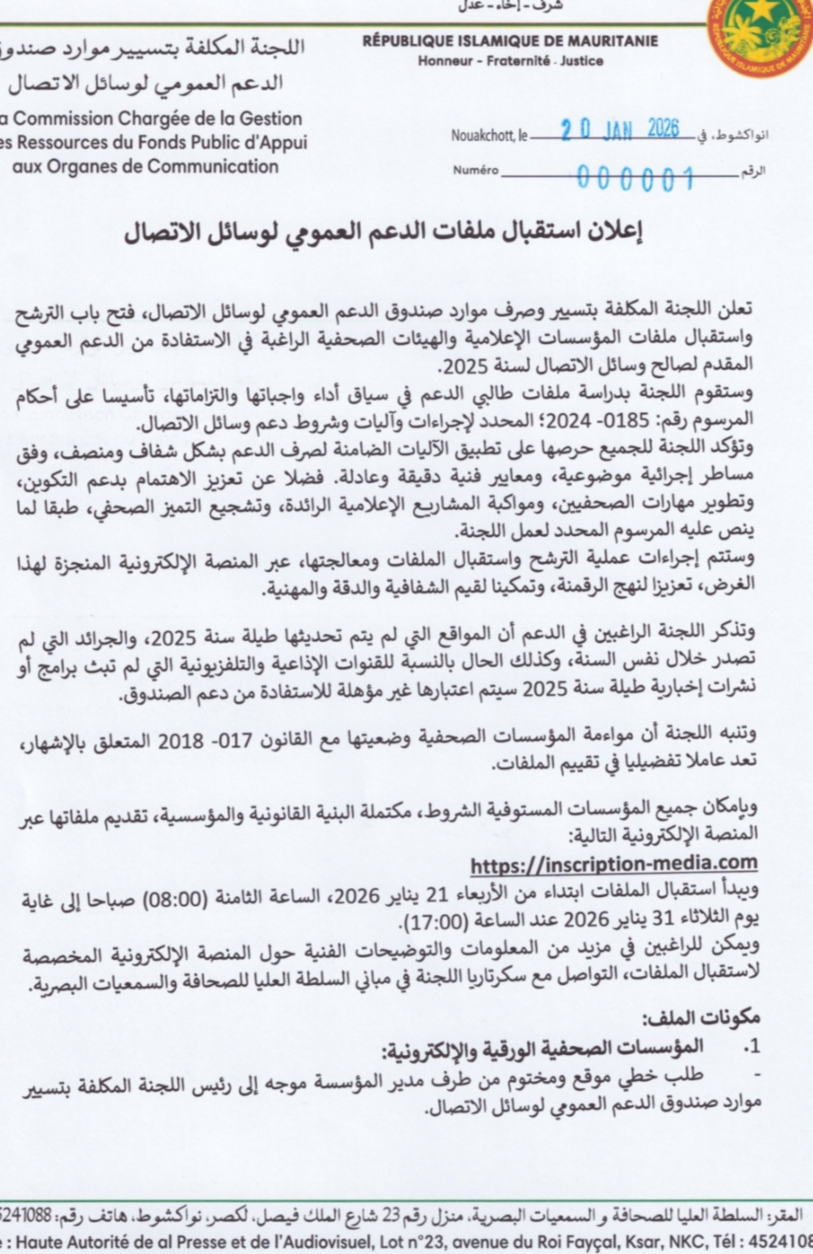 أعلنت اللجنة المكلفة بتسيير وصرف موارد صندوق الدعم العمومي لوسائل الاتصال، فتح باب الترشح واستقبال ملفات المؤسسات الإعلامية والهيئات الصحفية الراغبة في الاستفادة من الدعم العمومي المقدم لصالح وسائل الاتصال لسنة 2025.