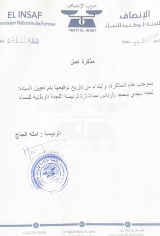 أصدرت رئيسة اللجنة النسائية بحزب الإنصاف مذكرة عمل بموجبها يتم تعيين الناشطة في الحزب تومنه سيدي محمد بارداس مستشارة الجنة النسائية.