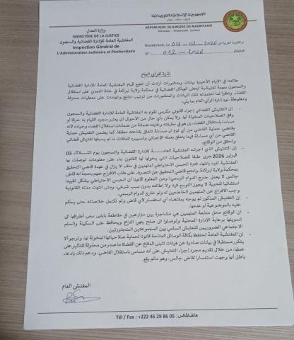 طالعتنا في الأيام الأخيرة بيانات ومنشورات أرادت أن تضع قيام المفتشية العامة للإدارة القضائية والسجون بمهمة تفتيش لبعض المسالك القضائية في محكمة ولاية لبراكنه في خانة التعدي على استقلال القضاء، ونظرًا لما اعتمدت عليه تلك البيانات والمنشورات من تزوير نتائج اتهامات على معطيات محرفة ومغلوطة، نود إنارة الرأي العام بما يلي: