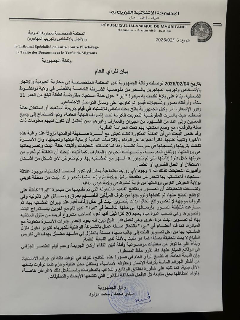بتاريخ 04/02/2026 توصلت وكالة الجمهورية لدى المحكمة المتخصصة في محاربة العبودية والاتجار بالأشخاص وتهريب المهاجرين بإشعار من مفوضية الشرطة الخاصة بالقُصَّر في ولاية نواكشوط الشمالية، بناءً على بلاغ تقدمت به مبادرة "إيرا" حول حالة استعباد مفترضة لطفلة تبلغ من العمر 11 سنة، وأرفقته بصور وتسجيلات فيديو تم تداولها على وسائل التواصل الاجتماعي.