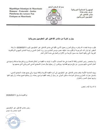 بقلوب مؤمنة بقضاء الله وقدره، وببالغ الحزن وعميق الأسى، تلقينا في منتدى الفاعلين غير الحكوميين اليوم 2026/03/11، نبأ وفاة المغفور لها بإذن الله المرحومة ام كلثوم منت اخليفه عضو مؤسس للمنتدى ومن رواد العمل المدني ورئيسة المنتدى الجهوي لانواكشوط الغربية، التي وافتها المنية بعد مسيرة كريمة من الالتزام والعمل في خدمة الشأن العام.