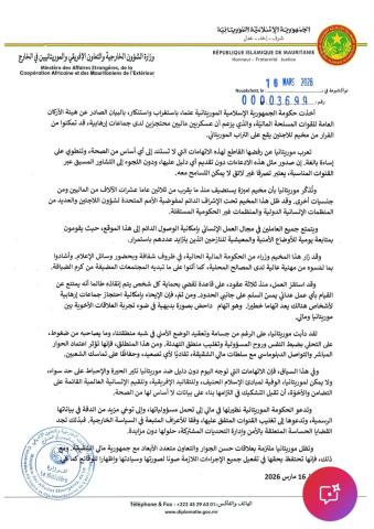 وأوضح البيان أن موريتانيا تتمسك بمبادئ الاحترام المتبادل وعدم التدخل في الشؤون الداخلية للدول، مشددة على أن علاقاتها الدولية تقوم على أساس التعاون المتوازن والشراكة القائمة على المصالح المشتركة.
