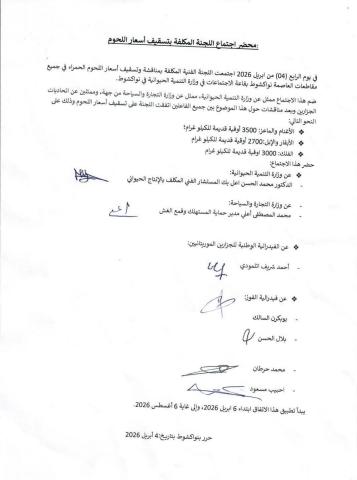 الاتفاق الجديد يضع تسعيرة موحدة لمختلف أنواع اللحوم، حيث تقرر بيع لحم الضأن والماعز بسعر 3500 أوقية قديمة للكيلوغرام، مقابل 2700 أوقية للحوم الإبل والبقر، فيما حُدد سعر "الفلكه" عند 3000 أوقية.