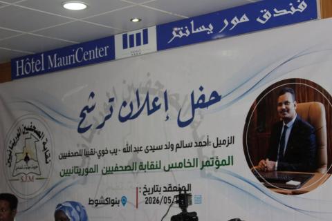 شهد فندق موري سانتى ومسك العاصمة مساء الأحد تنظيم حفل رسمي أعلن خلاله الإعلامي أحمد سالم سيدي عبد الله ترشحه لمنصب نقيب الصحفيين، وسط حضور لافت من الصحفيين والمهتمين بالشأن الإعلامي.
