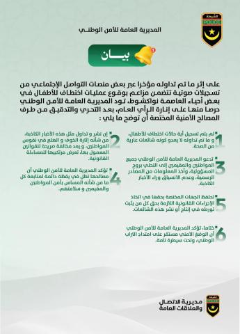نفت المديرية العامة للأمن الوطني بشكل قاطع صحة ما تم تداوله على بعض وسائل التواصل الاجتماعي بشأن وجود عمليات خطف أطفال في العاصمة نواكشوط، مؤكدة أن هذه الأخبار لا أساس لها من الصحة.