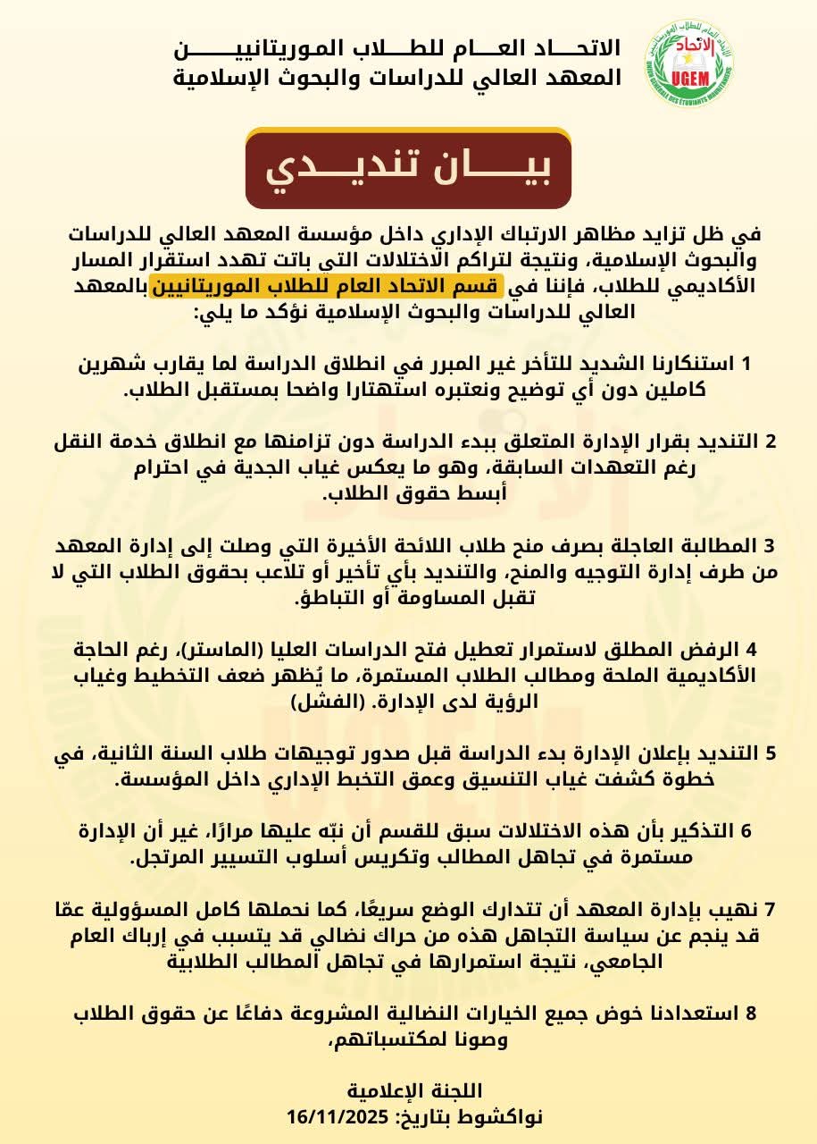 في ظل تزايد مظاهر الارتباك داخل المعهد العالي للدراسات والبحوث الإسلامية، وتراكم الأخطاء الإدارية التي باتت تهدد الموسم الجامعي وتؤثر بشكل مباشر على حياة الطلاب ومستقبلهم الأكاديمي، يصدر قسم الاتحاد العام للطلاب الموريتانيين هذا البيان ليوضح للرأي العام الطلابي أبرز الاختلالات المسجلة وموقفه منها.