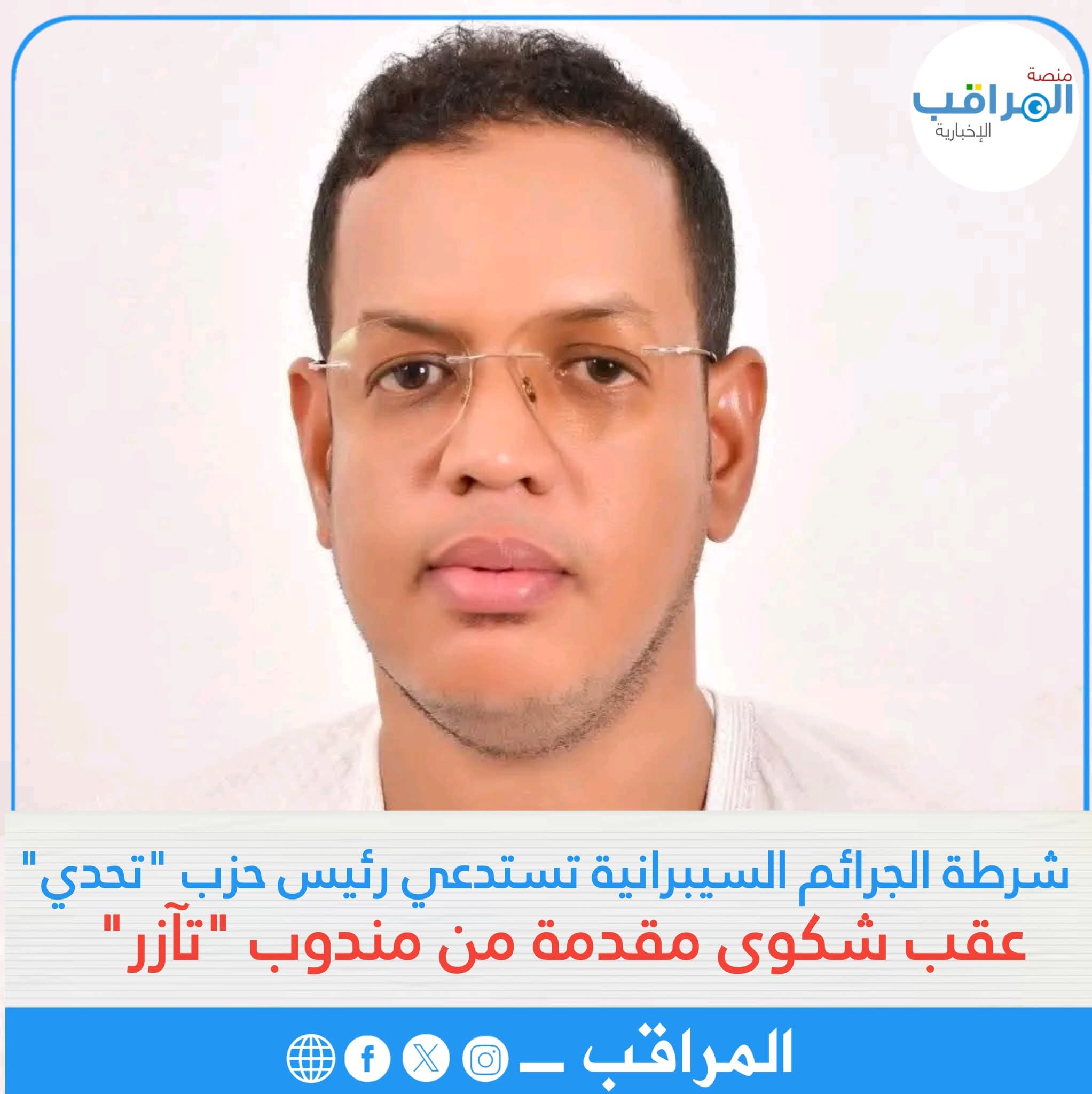 استدعت شرطة الجرائم السيبرانية زوال اليوم رئيس حزب تجديد الحركة الديمقراطية (تحدي)، السيد يعقوب أحمد لمرابط، وذلك على خلفية شكوى مقدمة ضده من طرف مندوب وكالة "تآزر"، السيد سيدي مولاي الزين، بصفته الرسمية.