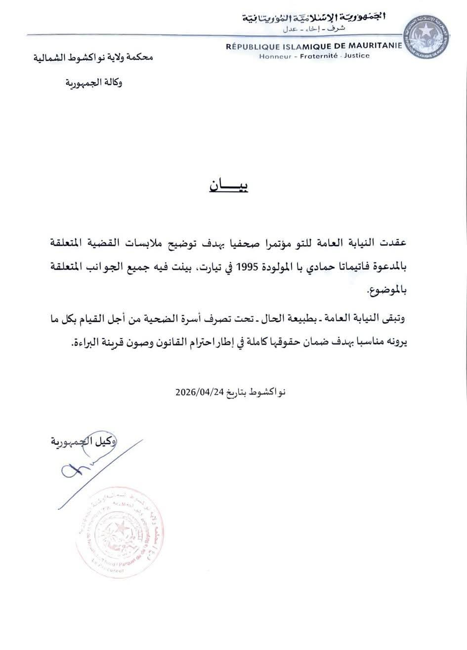 أعلنت اللجنة الوطنية لحقوق الإنسان أنها أوفدت بعثة ميدانية إلى مقر مكتب مكافحة الجريمة السيبرانية في نواكشوط، لمعاينة ظروف احتجاز النائبتين مريم الشيخ جنك وقامو عاشور سالم، خلال فترة الحراسة النظرية.